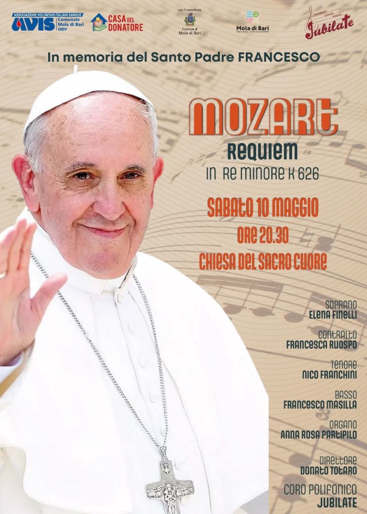 Si terrà sabato 10 Maggio dalle ore 20 alla Chiesa del Sacro Cuore di Mola di Bari il “Concerto del Requiem di Mozart” organizzato dall’ Avis Mola Di Bari con la Corale Jubilate diretta dal maestro Donato Totaro.