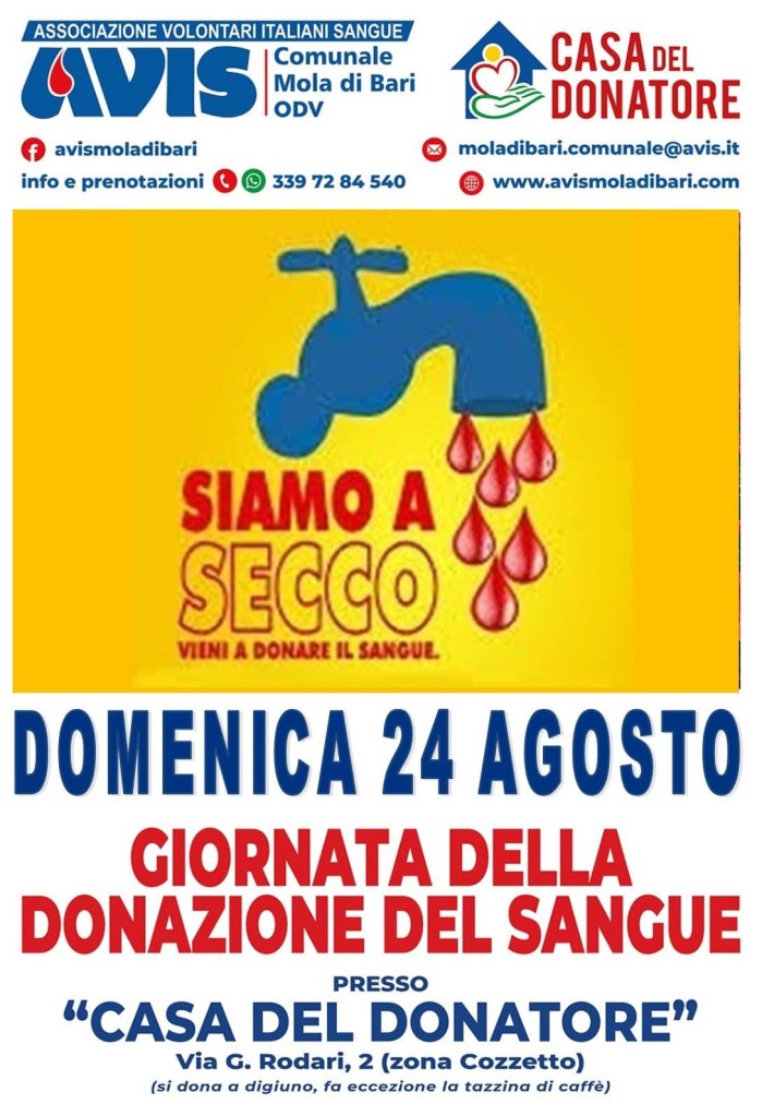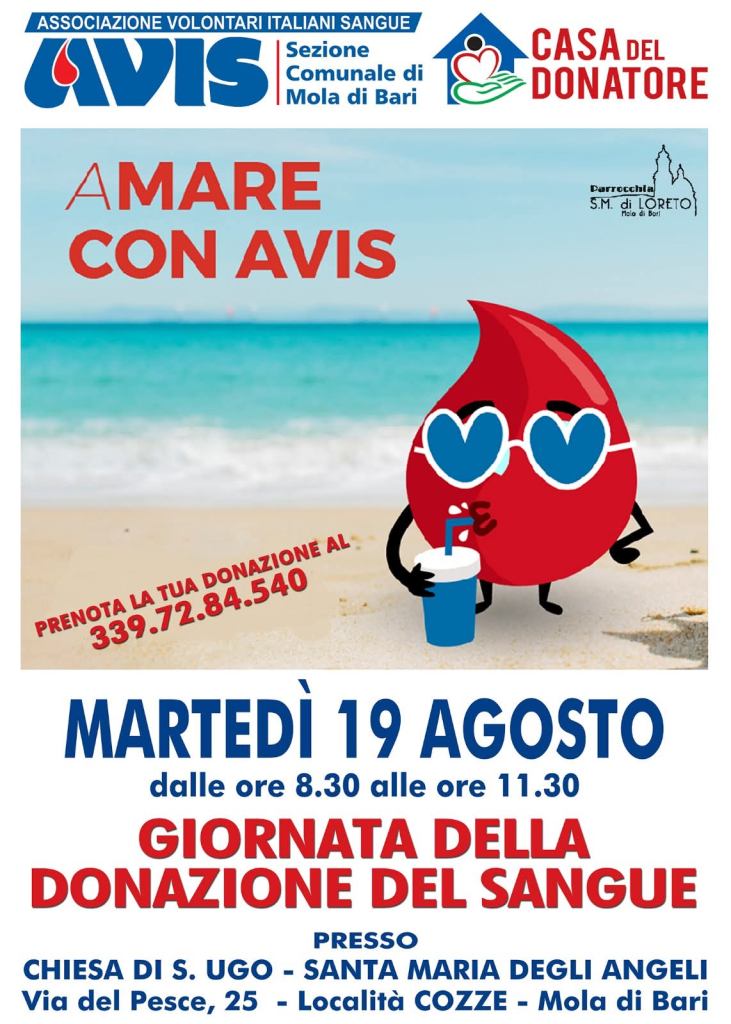Martedì 19 a Cozze presso la Chiesa di S. Ugo (Santa Maria degli Angeli) in via del pesce 25 e Domenica 24 Agosto presso la Casa del Donatore l' AVIS di Mola di Bari ha organizzato altre due giornate di donazione del sangue per cercare di affrontare la cronica carenza estiva. È importante continuare a donare sangue, anche in questi mesi estivi, per assicurare cure a chi ne ha bisogno. E si può donare e ricevere sangue in assoluta sicurezza” la Regione ha infatti attivato il test WNV-NAT che viene eseguito, in aggiunta a quelli già previsti, su tutte le donazioni effettuate da chi ha soggiornato, anche solo per una notte, in zone dove la presenza del virus West Nile Virus (trasmesso principalmente attraverso la puntura delle zanzare) è stata confermata”. Invitiamo tutti i donatori, nuovi e abituali, a continuare a donare. Vorremmo anche ringraziare il personale del CT Policlinico di Bari per l’impegno e la passione con cui lavora”. Prenota al 3397284540 è importante!