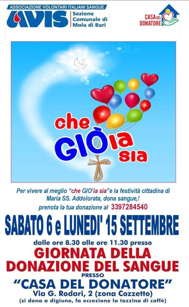 A settembre si rinnova l'appello dell' Avis Mola Di Bari a donare il sangue e gli emocomponenti, perché la disponibilità di scorte è fondamentale per garantire le terapie a chi ne ha bisogno. Il mese di settembre, spesso influenzato dalla fine dell'estate e dalla ripresa delle attività, richiede un impegno costante da parte dei cittadini per sopperire alle eventuali carenze e assicurare la continuità delle forniture. Prenota la tua donazione al 3397284540... grazie