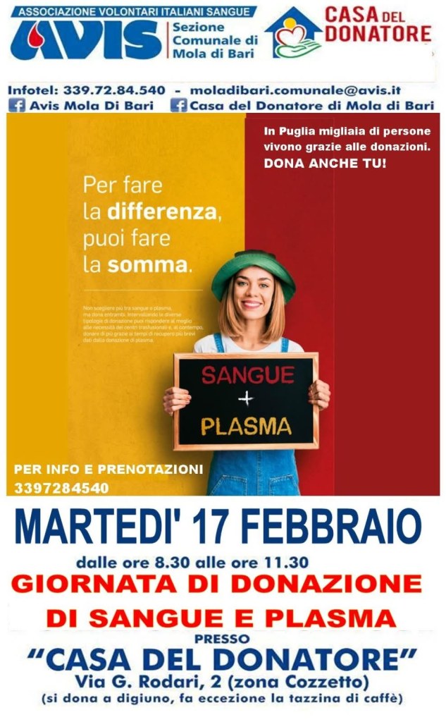 Finalmente! da martedì 17 febbraio presso la Casa del Donatore, nelle giornate concordate con il CT del Policlinico di Bari, sarà possibile donare anche il plasma, una risorsa molte volte trascurata ma molto importante per le sue finalità. Un obiettivo raggiunto con grandi sforzi ma con il vostro importante sostegno.